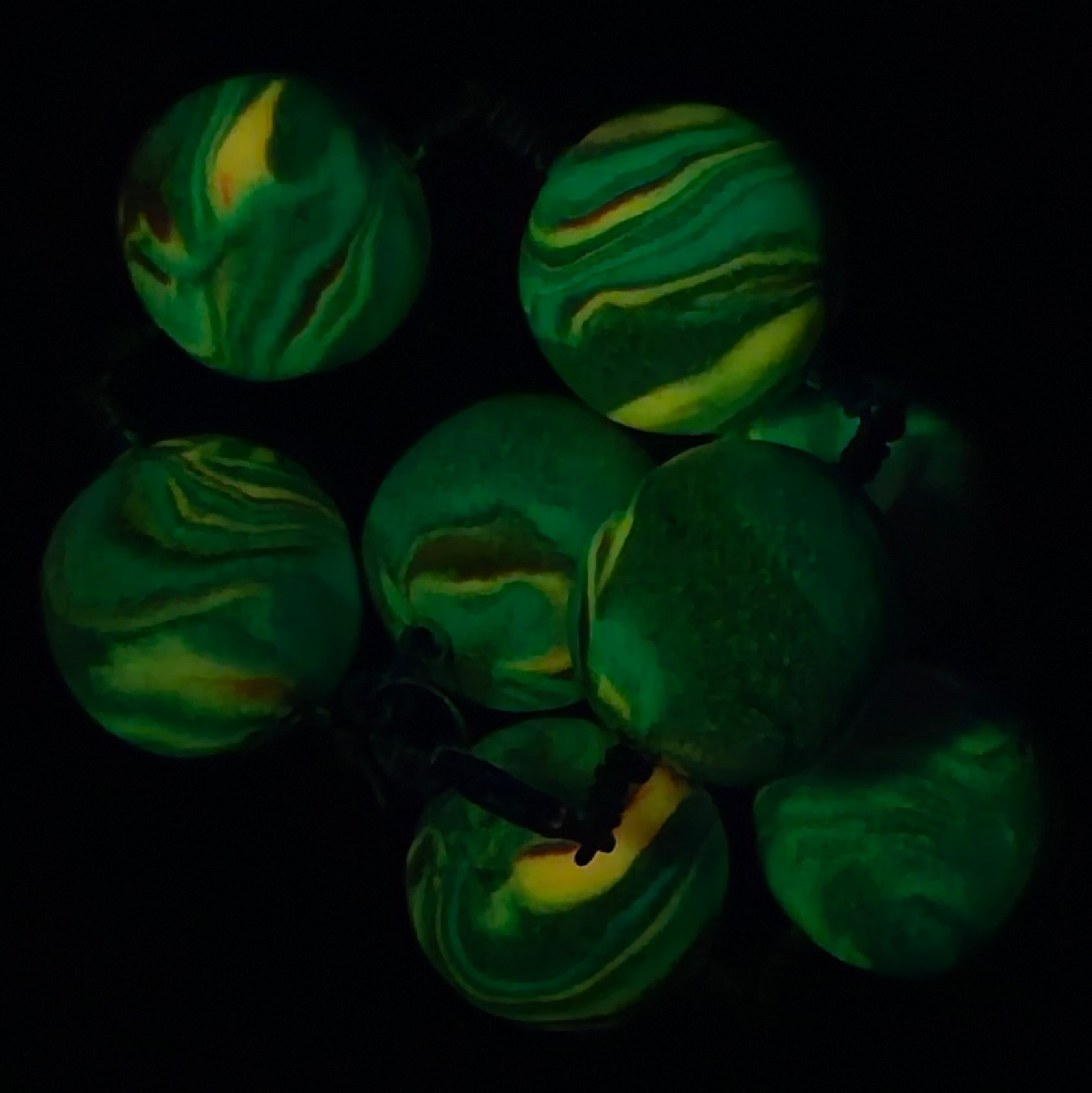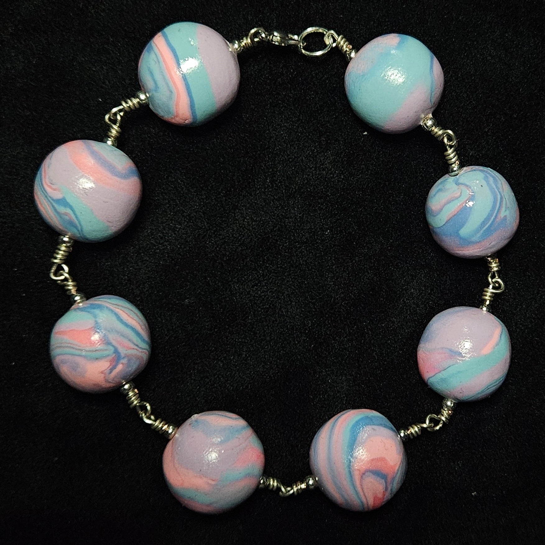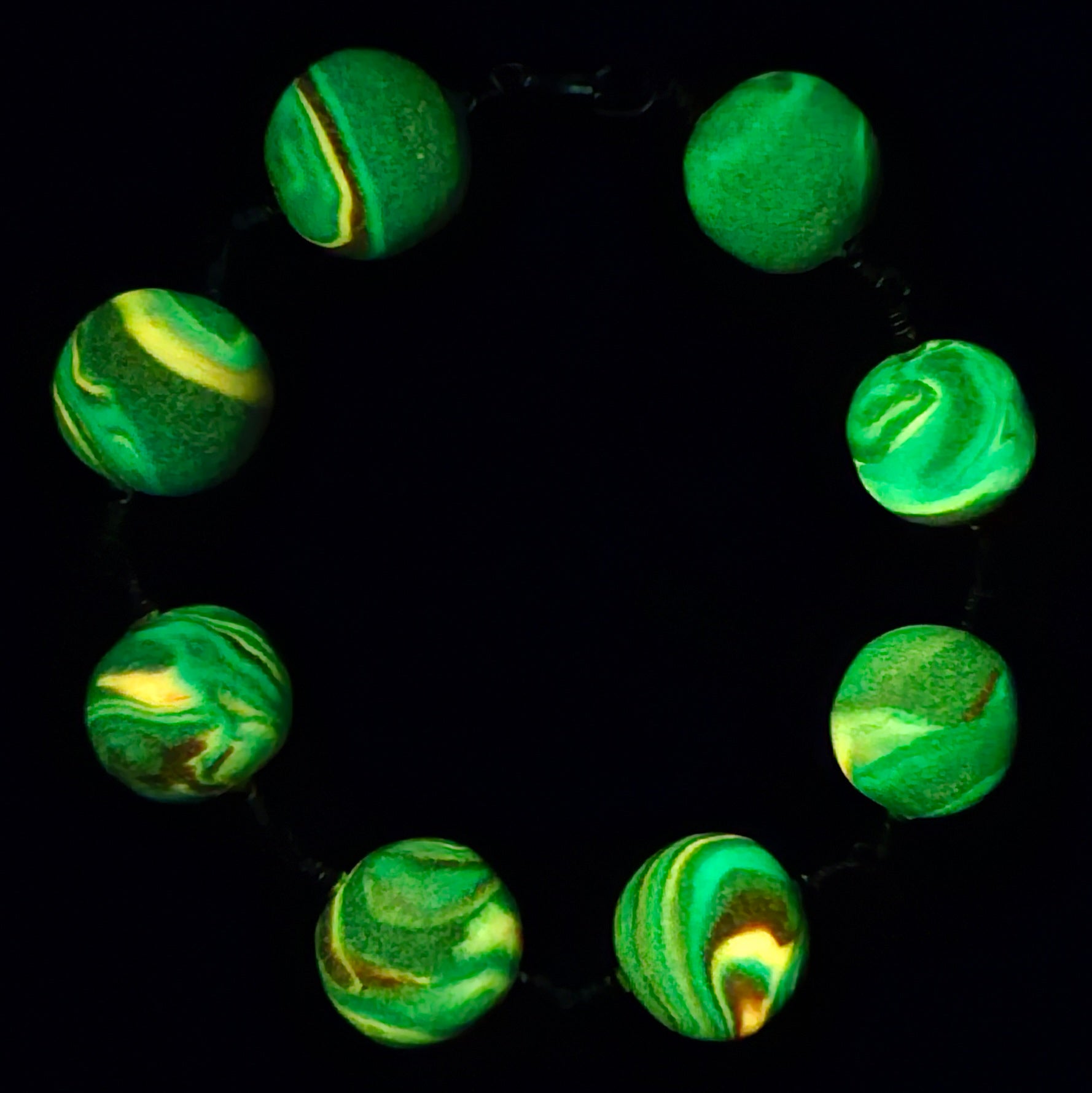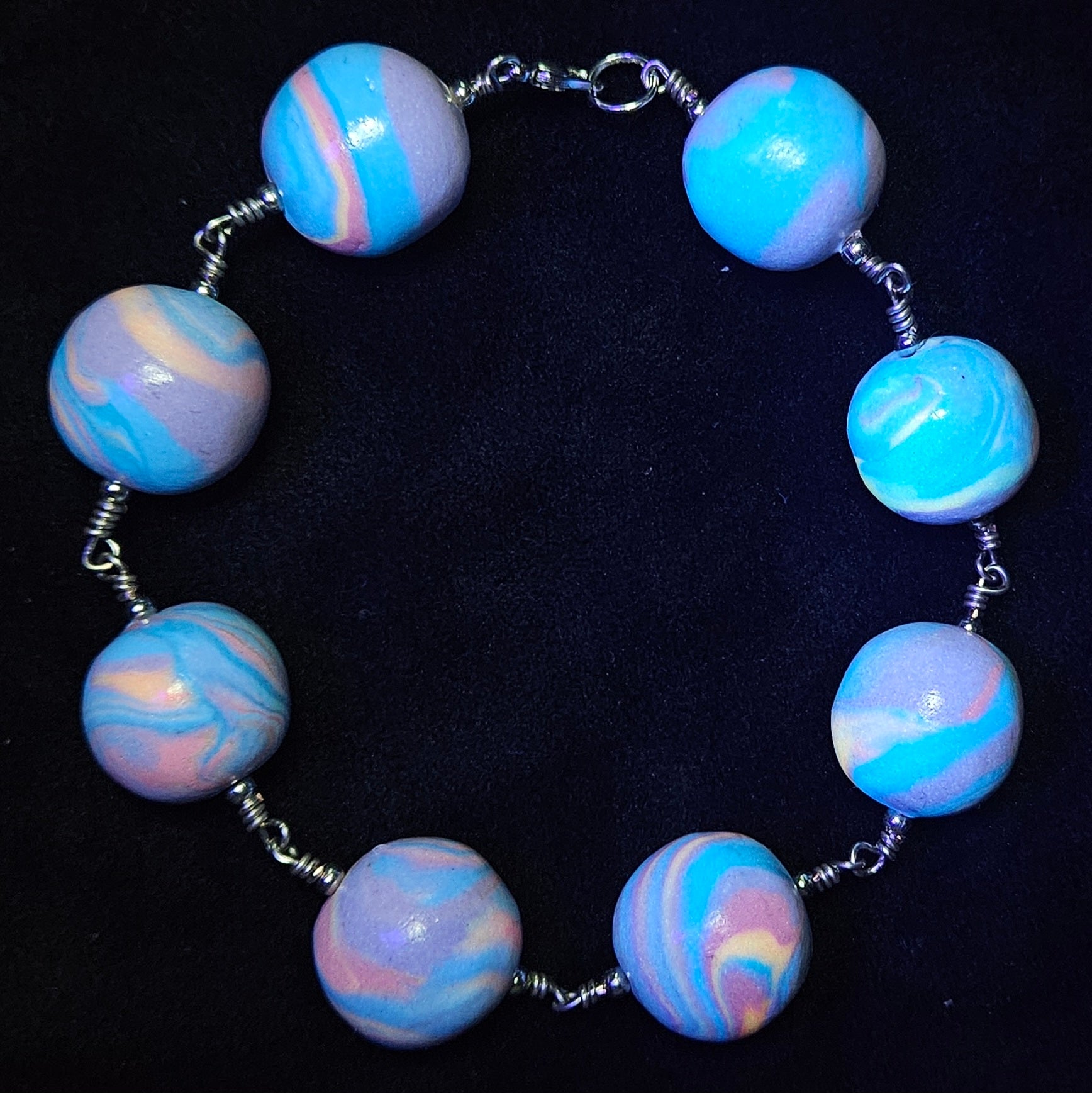 Hand sculpted light reactive polymer beads, hand wrapped silver stainless steel wire