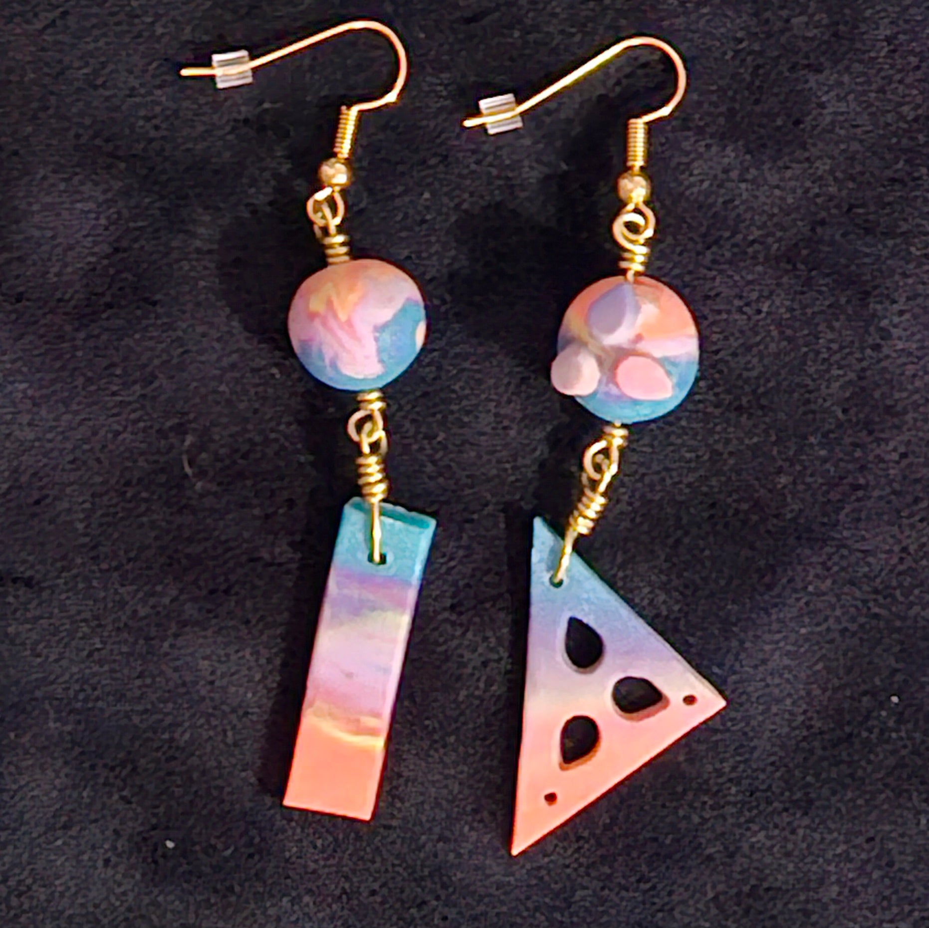 Asymmetrical bead and geometric shape dangle earrings in orange and blue.